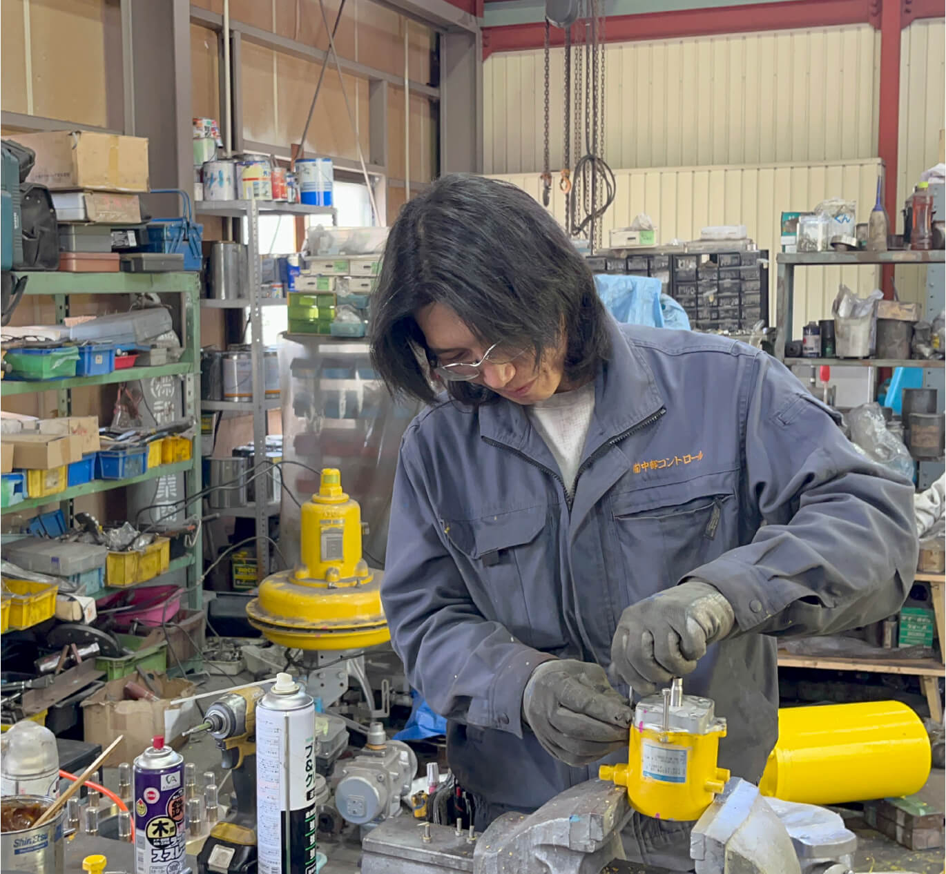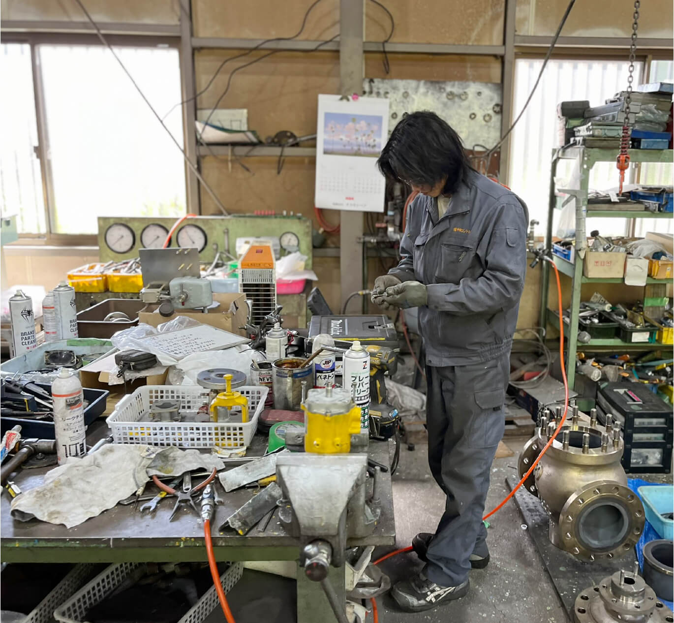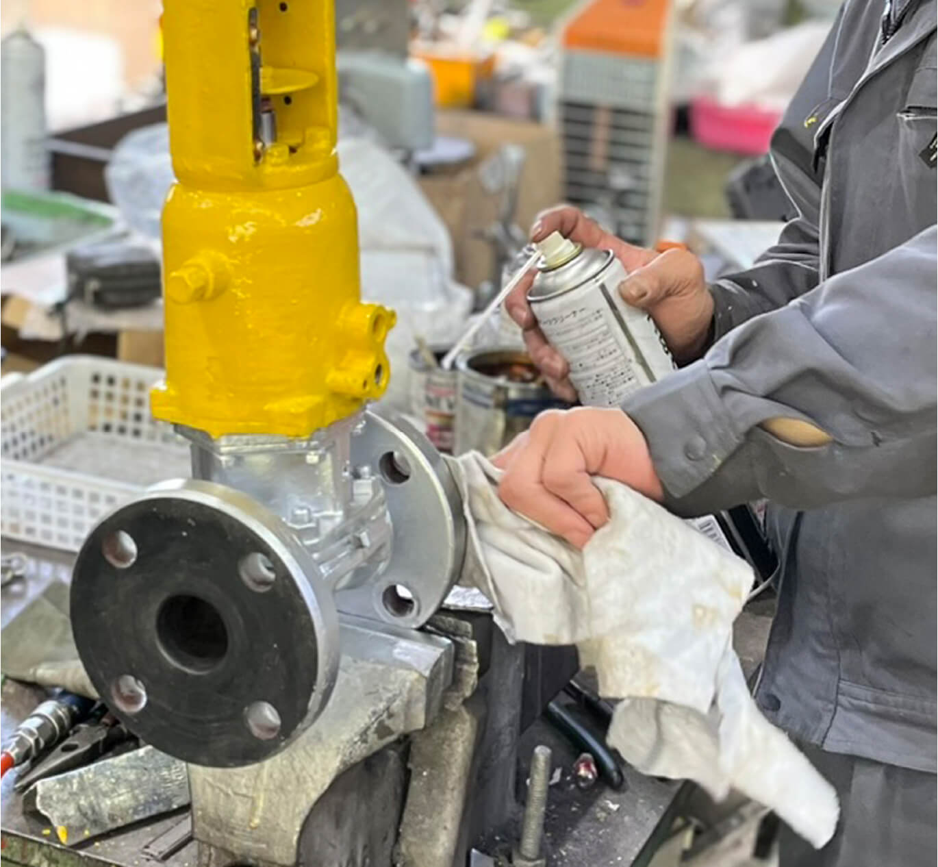 工場内で使われる液体や気体の制御を行う、「コントロールバルブ」と呼ばれる設備のメンテナンスを行います。